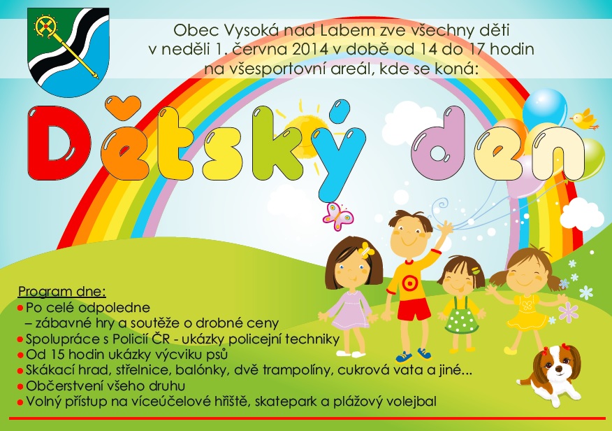 Obec Vysoká nad Labem zve všechny děti v neděli 1. června 2014 v době od 14 do 17 hodin do sportovního areálu na DĚTSKÝ DEN!