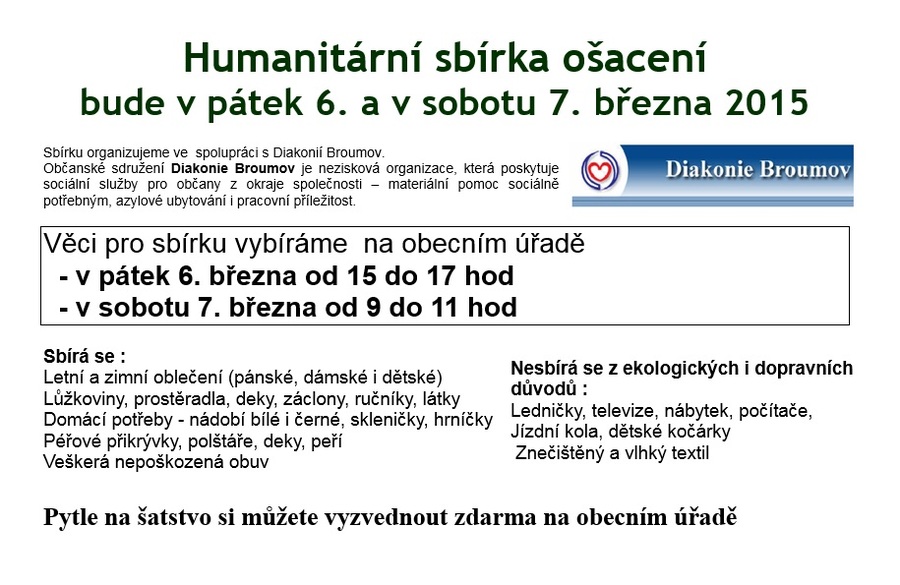 Sbírku organizujeme ve  spolupráci s Diakonií Broumov. Pytle na šatstvo si můžete vyzvednout zdarma na obecním úřadě.