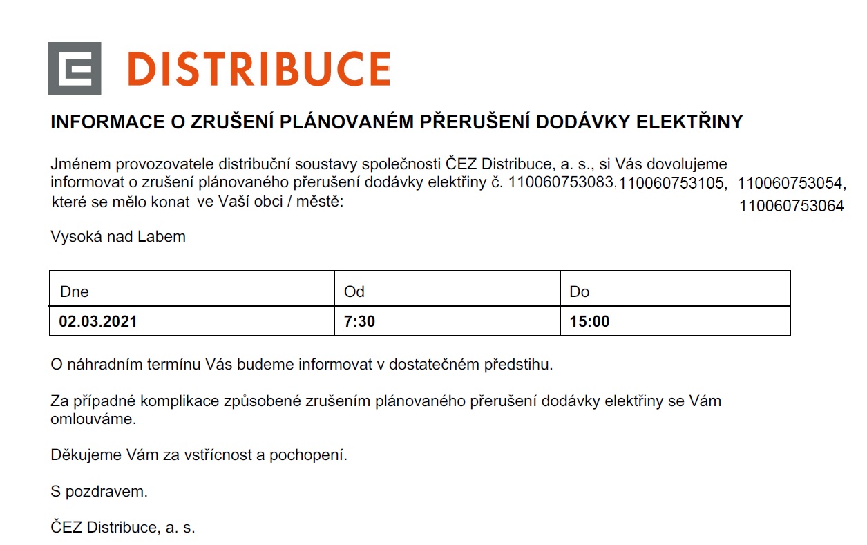 Dle vyjádření společnosti CEZ Distribuce, a. s. se přerušení dodávky elektřiny odkládá, o náhradním termínu nás budou vČas informovat.