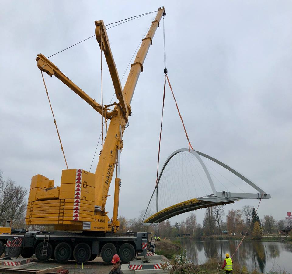 V sobotu 10.11.2018 proběhlo osazení mostní konstrukce. V noci dorazil jeřáb v doprovodu tří kamionů a dalších doprovodných vozidel až z daleké Břeclavi a do brzkých ranních hodin probíhalo jeho sestavení. Samotné zvednutí téměř 40 tun těžké a více než 50 metrů dlouhé konstrukce lávky a její přesun na připravené základy proběhl bez nejmenších problémů. Děkujeme všem zúčastněným za perfektně a precizně odvedenou práci!