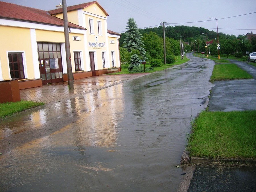 Extrémní déšť provázený krupobitím se přihnal v neděli 9.6.2013 krátce po 17. hodině. Trval pouze cca 15 minut, ale spadlo obrovské množství vody. Kanalizace nestačila vodní příval pobrat a voda se volně hnala po silnici, vnikla do několika sklepů, dvorů a zahrad, s jejím čerpáním pomáhali i hasiči.