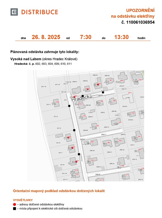 Plánovaná odstávka zahrnuje tyto lokality: Hradecká: č. p. 602, 603, 604, 609, 610, 611