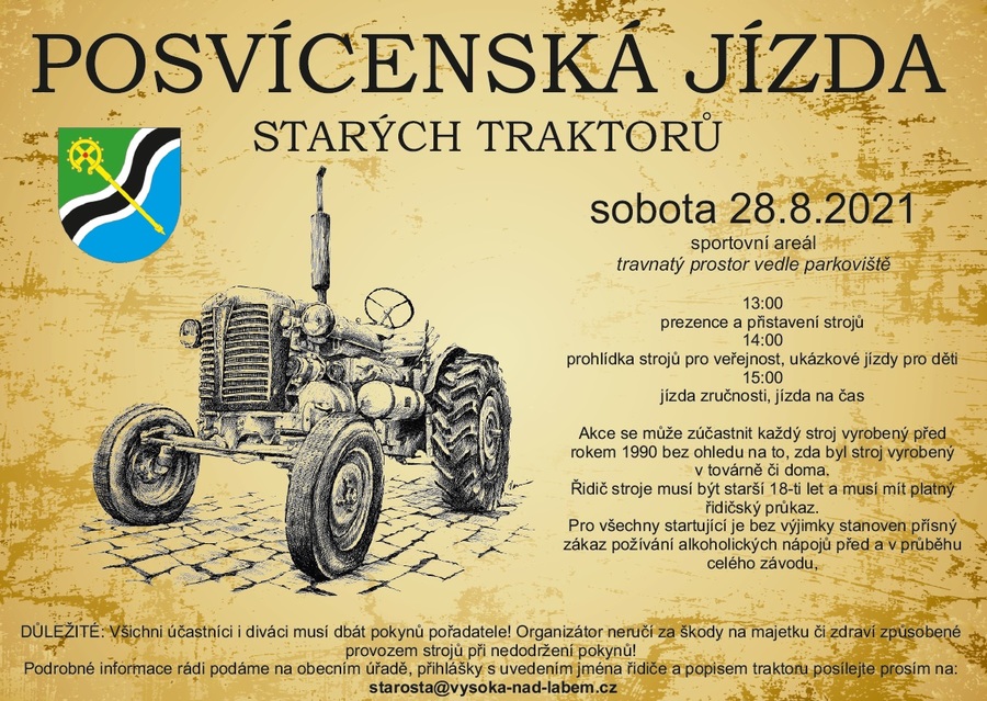 Podrobné informace rádi podáme na obecním úřadě, přihlášky s uvedením jména řidiče a popisem traktoru posílejte prosím na: starosta@vysoka-nad-labem.cz