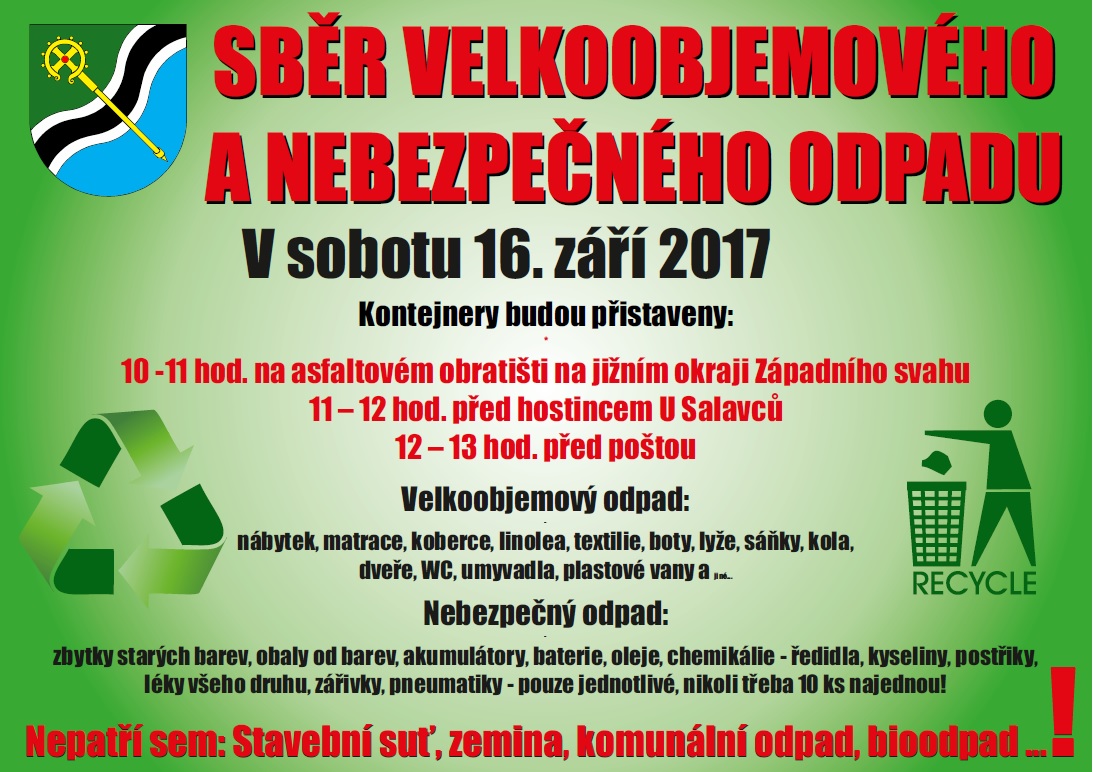 - Velkoobjemový odpad: nábytek, matrace, koberce, linolea, textilie, boty, lyže, sáňky, kola, dveře, WC, umyvadla, plastové vany,..