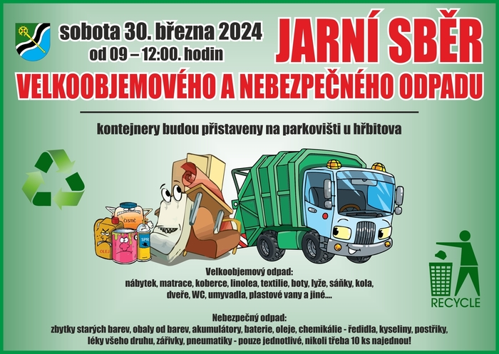 Velkoobjemový odpad: nábytek, matrace, koberce, linolea, textilie, boty, lyže, sáňky, kola,dveře, WC, umyvadla, plastové vany a jiné....