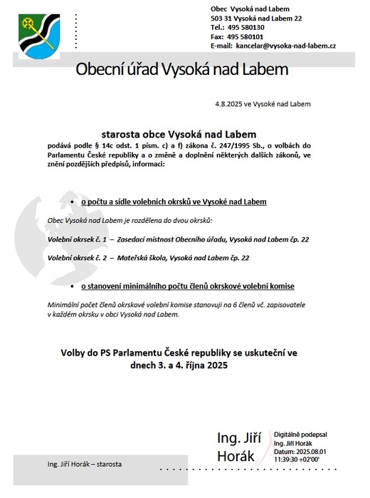 Informace o počtu a sídle volebních okrsků ve Vysoké nad Labem: https://vysokanl.imunis.cz/edeska/file?id=51342