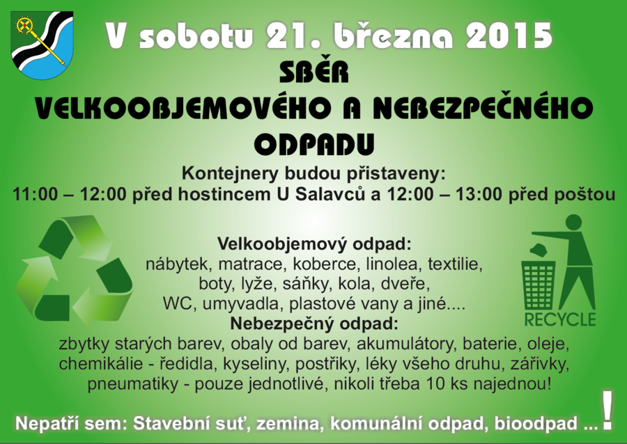 • Sběr velkoobjemového a nebezpečného odpadu. Kontejnery budou přistaveny (pozor - o hodinu později než obvykle!):od 11 do 12 hodin před restaurací U Salavců a od 12 do 13 hodin před poštou. Uložení odpadu je pro občany obce zdarma!