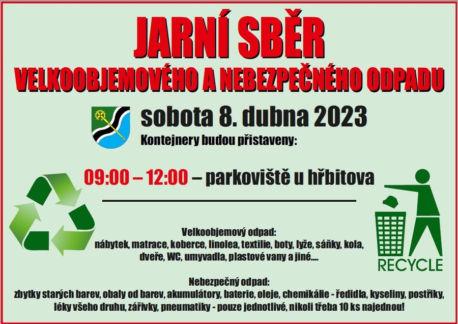 - 09:00 – 12:00 hodin, parkoviště u hřbitova: sběr velkoobjemového a nebezpečného odpadu