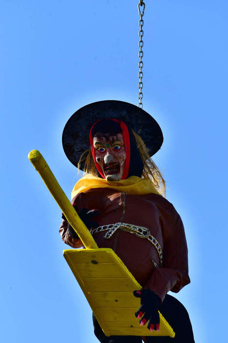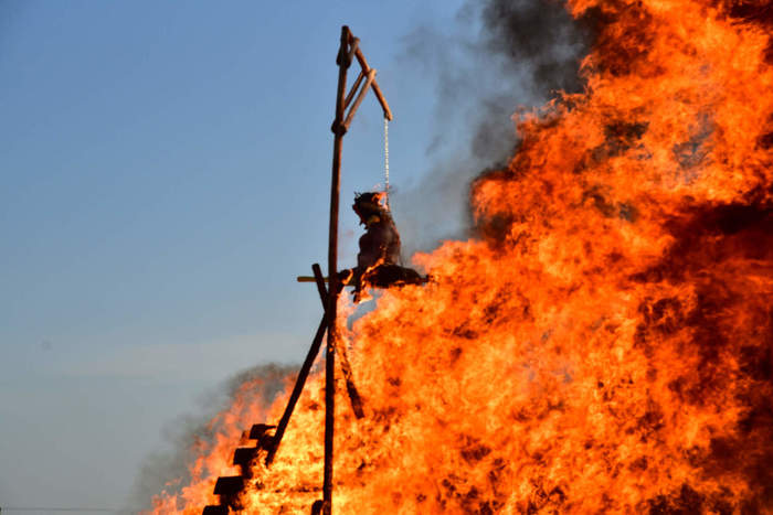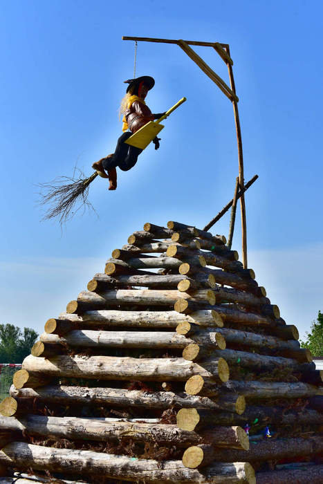 Letos jsme si připravili jednu specialitu - nad čarodějnickou hranicí byly vztyčena konstrukce připomínající šibenici a na ni byla zavěšena speciální létající čarodějnice. Vše vymyslel a autorem čarodějnice byl zdejší rodák a všeuměl Milan Danihelka.