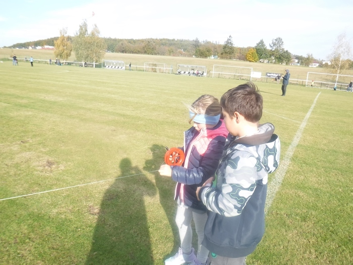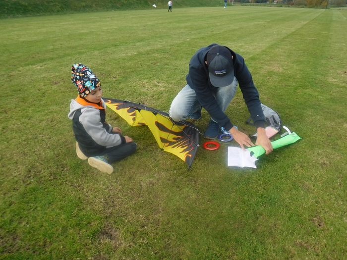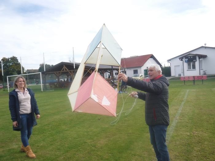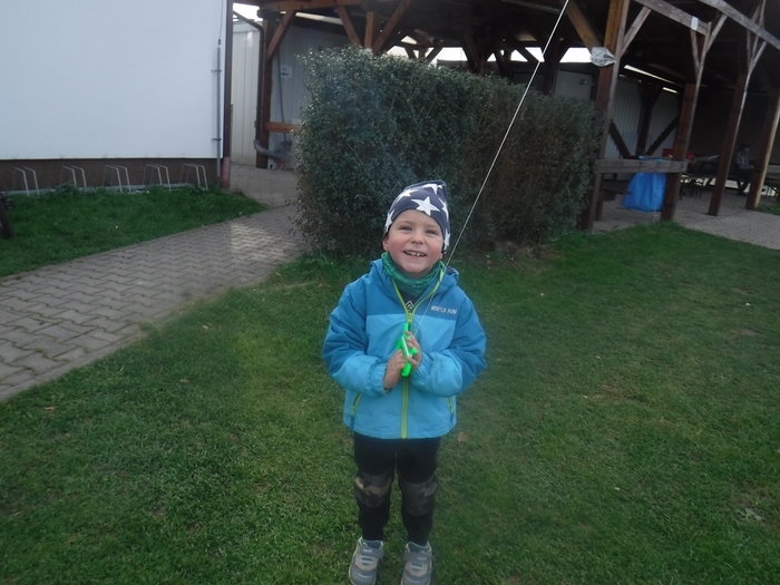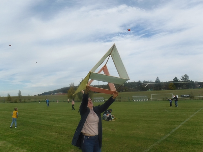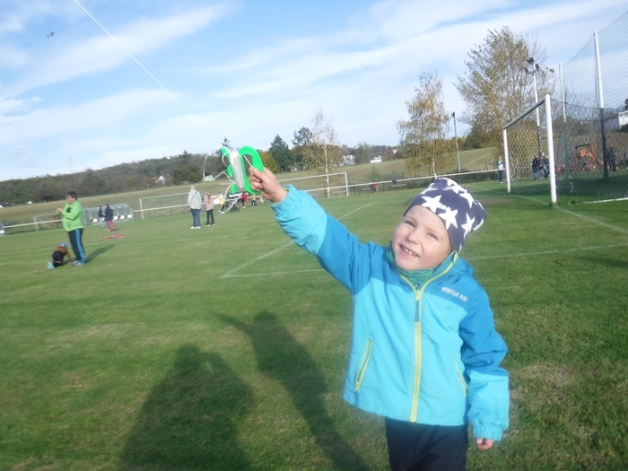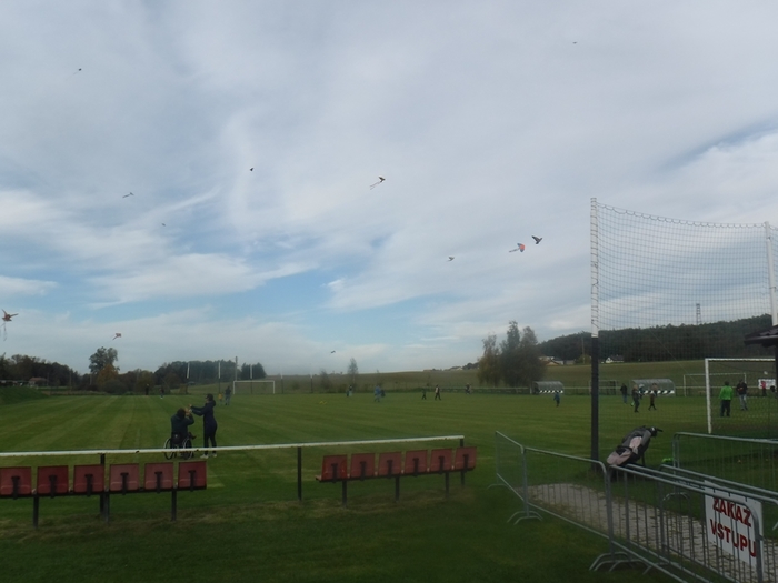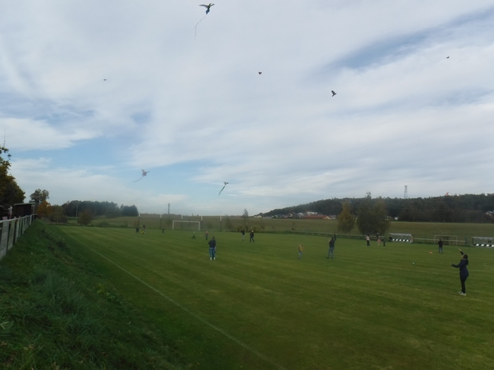 Stejně jako vloni jsme měli na drakiádě ideální počasí. Vítr foukal jak na objednávku, občas i zasvitlo sluníčko, prostě super. Nebe nad fotbalovým hřištěm bylo plné draků.