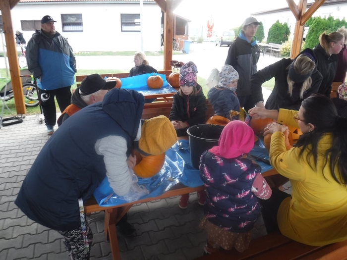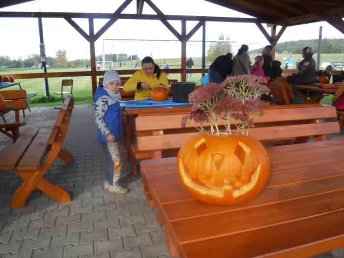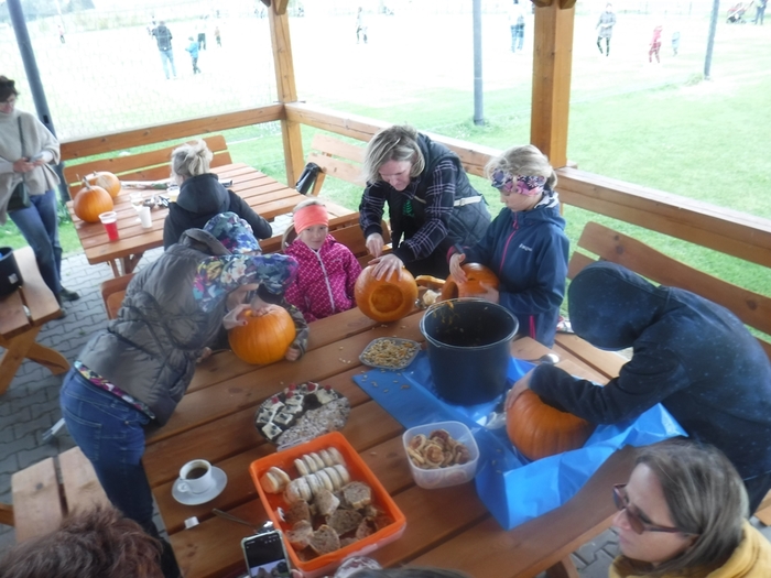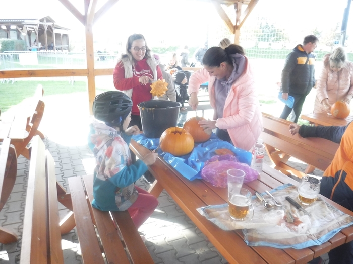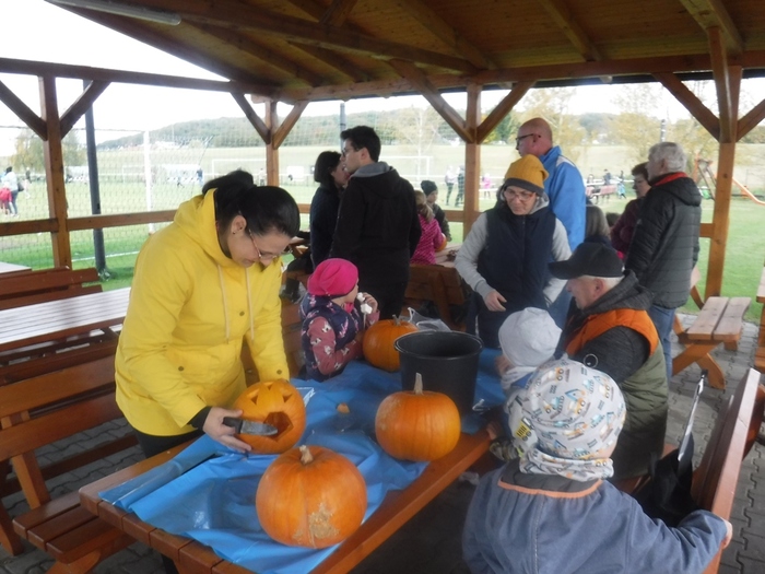 Dalším bodem programu bylo dlabání dýní. Pro návštěvníky bylo připraveno 50 dýní a několik hotových jako vzor. Stačil nůž a lžíce na dlabání, plus fantazie, a vznikaly krásné halloweenské dekorace.