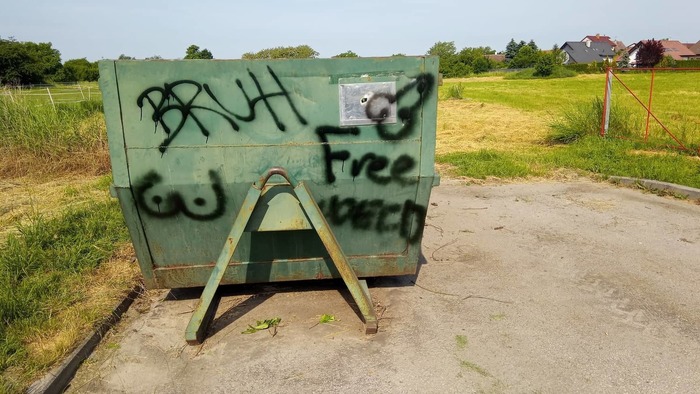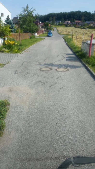 Na dětském hřišti u mlhoviště byla umístena tabulka upozorňující majitele psů na zákaz venčení. Před několik dny neznámý vandal tuto ceduli nejdříve poškodil (ohnul) a pak posprejoval. Další nápisy černým sprejem jsou na silnici, na kontejneru a leckde jinde.