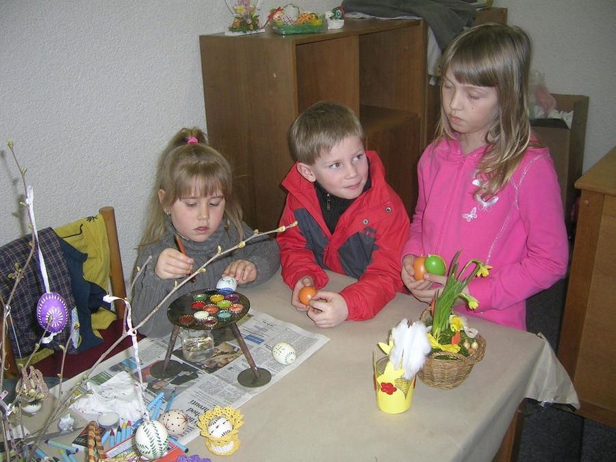 Jako každoročně i letos jsme se společně sešli na obecním úřadě připomenout si jaro a lidové zvyky související s Velikonocemi. Letošní velikonoční tvoření se konalo na květnou neděli, 28.3.2010. Návštěvníci malovali vajíčka, zdobili věnečky, květináče a jiné dekorativní drobnosti, zájem byl o pletení pomlázek i o práci kováře s výhní. Nechybělo oblíbené zdobení perníčků cukrovou polevou. K občerstvení a pro dobrou náladu bylo k dispozici svařené víno, pro děti zdarma čaj.